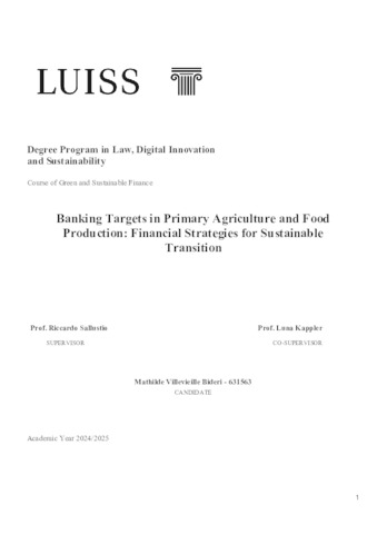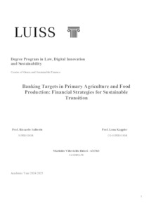Villevieille Bideri, Mathilde (A.A. 2024/2025) Banking targets in primary agriculture and food production: financial strategies for sustainable transition. Tesi di Laurea in Green & sustainable finance, Luiss Guido Carli, relatore Riccardo Sallustio, pp. 181. [Master's Degree Thesis]