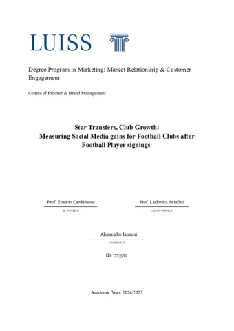Iannone, Alessandro (A.A. 2024/2025) Star transfers, club growth: measuring social media gains for football clubs after football player signings. Tesi di Laurea in Product & brand management, Luiss Guido Carli, relatore Ernesto Cardamone, pp. 81. [Master's Degree Thesis]