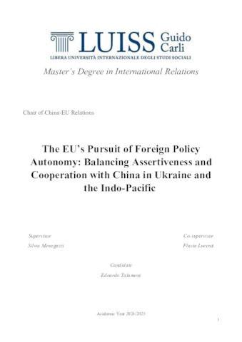Talamoni, Edoardo (A.A. 2024/2025) The EU’s pursuit of foreign policy autonomy: balancing assertiveness and cooperation with China in Ukraine and the Indo-Pacific. Tesi di Laurea in Chair of China-EU relations, Luiss Guido Carli, relatore Silvia Menegazzi, pp. 165. [Master's Degree Thesis]