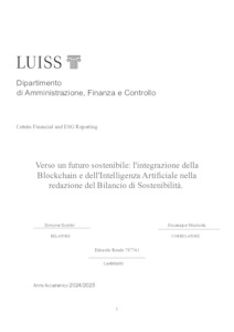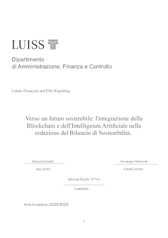 Rende, Edoardo (A.A. 2024/2025) Verso un futuro sostenibile: l'integrazione della Blockchain e dell'intelligenza artificiale nella redazione del bilancio di sostenibilità. Tesi di Laurea in Financial and ESG reporting, Luiss Guido Carli, relatore Simone Scettri, pp. 146. [Master's Degree Thesis]
