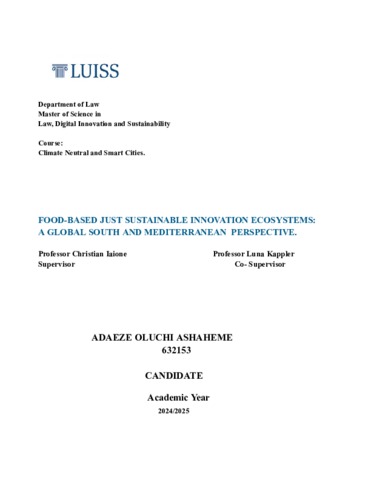 Ashaheme, Adaeze Oluchi (A.A. 2024/2025) Food-based just sustainable innovation ecosystems: a global South and Mediterranean perspective. Tesi di Laurea in Climate-neutral & smart cities, Luiss Guido Carli, relatore Fernando Christian Iaione, pp. 91. [Master's Degree Thesis]