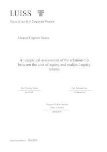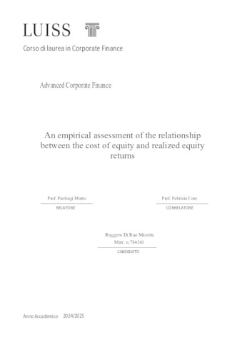Di Rao Marotta, Ruggero (A.A. 2024/2025) An empirical assessment of the relationship between the cost of equity and realized equity returns. Tesi di Laurea in Advanced corporate finance, Luiss Guido Carli, relatore Pierluigi Murro, pp. 38. [Master's Degree Thesis]