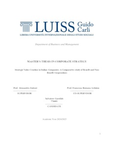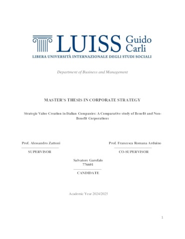 Garofalo, Salvatore (A.A. 2024/2025) Strategic value creation in Italian companies: a comparative study of benefit and non-benefit corporations. Tesi di Laurea in Corporate strategy, Luiss Guido Carli, relatore Alessandro Zattoni, pp. 48. [Master's Degree Thesis]