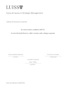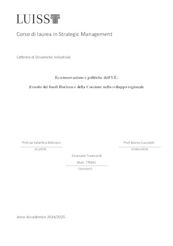 Trasmondi, Emanuele Maria (A.A. 2024/2025) Eco-innovazione e politiche dell’UE: il ruolo dei fondi Horizon e della coesione nello sviluppo regionale. Tesi di Laurea in Dinamiche industriali, Luiss Guido Carli, relatore Valentina Meliciani, pp. 118. [Master's Degree Thesis]