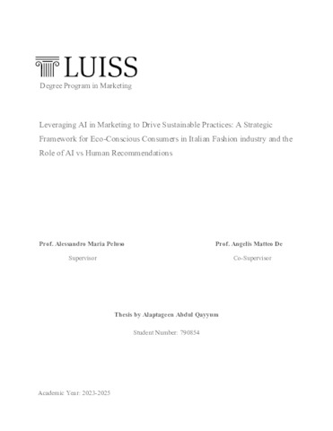 Abdul Qayyum, Alaptageen (A.A. 2024/2025) Leveraging AI in marketing to drive sustainable practices: a strategic framework for eco-conscious consumers in Italian fashion industry and the role of AI vs human recommendations. Tesi di Laurea in Sustainability for marketing, Luiss Guido Carli, relatore Alessandro Maria Peluso, pp. 90. [Master's Degree Thesis]