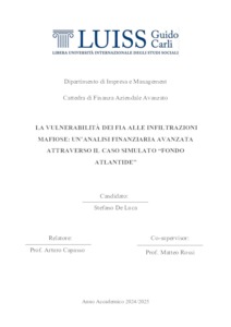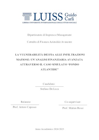 De Luca, Stefano (A.A. 2024/2025) La vulnerabilità dei FIA alle infiltrazioni mafiose: un’analisi finanziaria avanzata attraverso il caso simulato Fondo Atlantide. Tesi di Laurea in Finanza aziendale avanzato, Luiss Guido Carli, relatore Arturo Capasso, pp. 102. [Master's Degree Thesis]