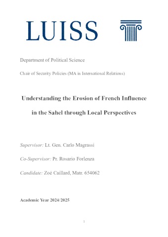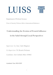 Caillard, Zoé (A.A. 2024/2025) Understanding the erosion of French influence in the Sahel through local perspectives. Tesi di Laurea in Security policies, Luiss Guido Carli, relatore Carlo Magrassi, pp. 245. [Master's Degree Thesis]