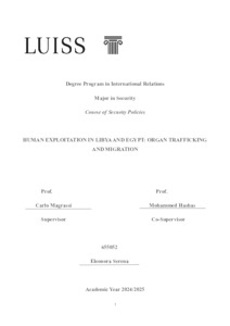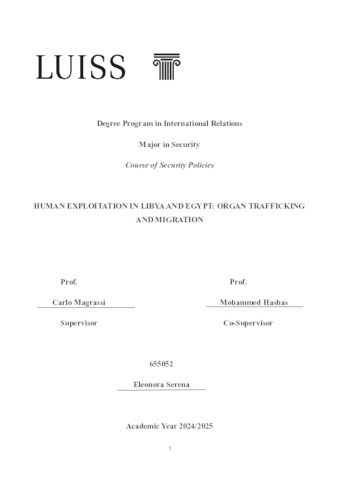 Serena, Eleonora (A.A. 2024/2025) Human exploitation in Libya and Egypt: organ trafficking and migration. Tesi di Laurea in Security policies, Luiss Guido Carli, relatore Carlo Magrassi, pp. 169. [Master's Degree Thesis]