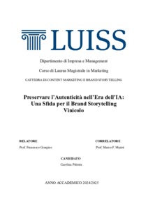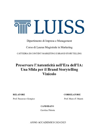 Polenta, Carolina (A.A. 2024/2025) Preservare l’autenticità nell’era dell’IA: una sfida per il brand storytelling vinicolo. Tesi di Laurea in Content marketing e brand storytelling, Luiss Guido Carli, relatore Francesco Giorgino, pp. 85. [Master's Degree Thesis]