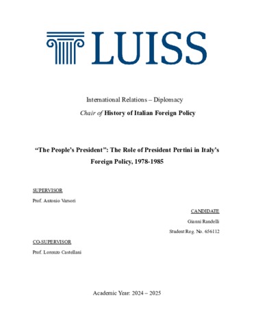Randelli, Gianni (A.A. 2024/2025) The people’s president: the role of president Pertini in Italy’s foreign policy, 1978-1985. Tesi di Laurea in History of Italian foreign policy, Luiss Guido Carli, relatore Antonio Varsori, pp. 148. [Master's Degree Thesis]