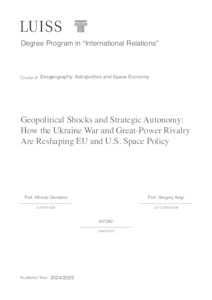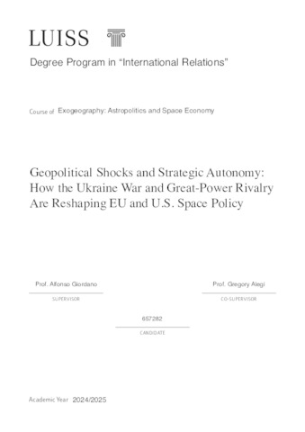 Tibaldo, Francesco (A.A. 2024/2025) Geopolitical shocks and strategic autonomy: how the Ukraine war and great-power rivalry are reshaping EU and US space policy. Tesi di Laurea in Exogeography: astropolitics and space economy, Luiss Guido Carli, relatore Alfonso Giordano, pp. 120. [Master's Degree Thesis]