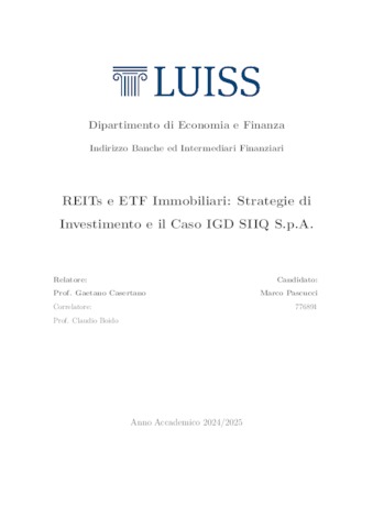 Pascucci, Marco (A.A. 2024/2025) REITs e ETF immobiliari: strategie di investimento e il caso IGD SIIQ S.p.a. Tesi di Laurea in Real estate finance, Luiss Guido Carli, relatore Gaetano Casertano, pp. 156. [Master's Degree Thesis]
