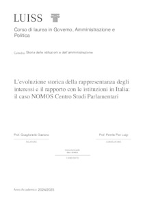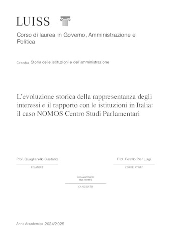 Zammattio, Greta (A.A. 2024/2025) L’evoluzione storica della rappresentanza degli interessi e il rapporto con le istituzioni in Italia: il caso NOMOS Centro Studi Parlamentari. Tesi di Laurea in Storia delle istituzioni e dell'amministrazione, Luiss Guido Carli, relatore Gaetano Quagliariello, pp. 113. [Master's Degree Thesis]