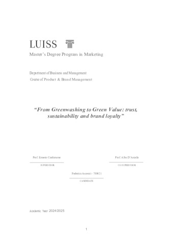 Ascenzi, Federica (A.A. 2024/2025) From greenwashing to green value: trust, sustainability and brand loyalty. Tesi di Laurea in Product & brand management, Luiss Guido Carli, relatore Ernesto Cardamone, pp. 86. [Master's Degree Thesis]