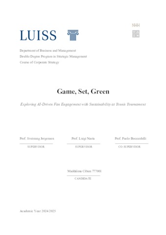 Cibien, Maddalena (A.A. 2024/2025) Game, Set, Green: exploring AI-driven fan engagement with sustainability at tennis tournament. Tesi di Laurea in Corporate strategy, Luiss Guido Carli, relatore Luigi Nasta, pp. 74. [Master's Degree Thesis]