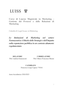 Capecce, Francesco Luigi (A.A. 2024/2025) Le limitazioni di marketing nel settore farmaceutico: il ruolo delle strategie e dell'impatto sulla reputazione pubblica in un contesto altamente regolamentato. Tesi di Laurea in Legal issues in marketing, Luiss Guido Carli, relatore Andrea Giannaccari, pp. 72. [Master's Degree Thesis]