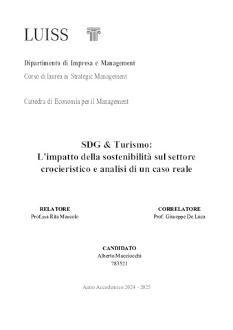 MAcciocchi, Alberto (A.A. 2024/2025) SDG & turismo: l'impatto della sostenibilità sul settore crocieristico e analisi di un caso reale. Tesi di Laurea in Economia per il management, Luiss Guido Carli, relatore Rita Mascolo, pp. 103. [Master's Degree Thesis]