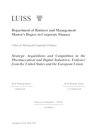 Granatiero, Francesco (A.A. 2024/2025) Strategic acquisitions and competition in the pharmaceutical and digital industries: evidence from the United States and the European Union. Tesi di Laurea in Advanced corporate finance, Luiss Guido Carli, relatore Pierluigi Murro, pp. 64. [Master's Degree Thesis]