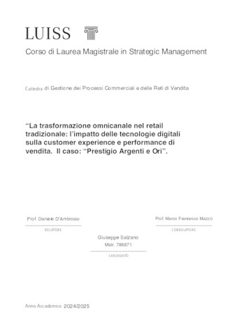 Salzano, Giuseppe (A.A. 2024/2025) La trasformazione omnicanale nel retail tradizionale: l’impatto delle tecnologie digitali sulla customer experience e performance di vendita: il caso: Prestigio Argenti e Ori. Tesi di Laurea in Gestione dei processi commerciali e delle reti di vendita, Luiss Guido Carli, relatore Daniele D'Ambrosio, pp. 109. [Master's Degree Thesis]