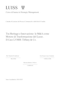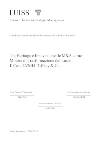 Bottoni, Eleonora (A.A. 2024/2025) Tra heritage e innovazione: le M&A come motore di trasformazione del lusso: il caso LVMH–Tiffany & Co. Tesi di Laurea in Gestione dei processi commerciali e delle reti di vendita, Luiss Guido Carli, relatore Daniele D'Ambrosio, pp. 113. [Master's Degree Thesis]
