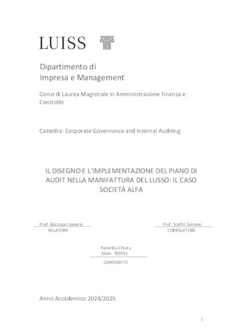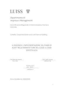 Palomba, Chiara (A.A. 2024/2025) Il disegno e l'implementazione del piano di audit nella manifattura del lusso: il caso società Alfa. Tesi di Laurea in Corporate governance and internal auditing, Luiss Guido Carli, relatore Saverio Bozzolan, pp. 104. [Master's Degree Thesis]