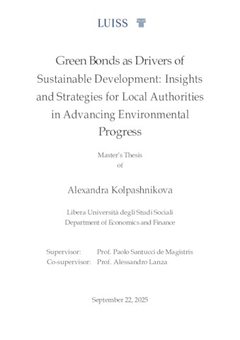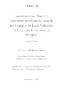 Kolpashnikova, Alexandra (A.A. 2024/2025) Green bonds as drivers of sustainable development: insights and strategies for local authorities in advancing environmental progress. Tesi di Laurea in Econometric theory, Luiss Guido Carli, relatore Paolo Santucci de Magistris, pp. 76. [Master's Degree Thesis]