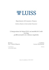 Mastantuoni, Lorenzo (A.A. 2024/2025) L’integrazione dei fattori ESG nei modelli di credit scoring: profili normativi ed evidenze empiriche. Tesi di Laurea in Diritto dei mercati e degli intermediari finanziari (corso progredito), Luiss Guido Carli, relatore Mirella Pellegrini, pp. 161. [Master's Degree Thesis]