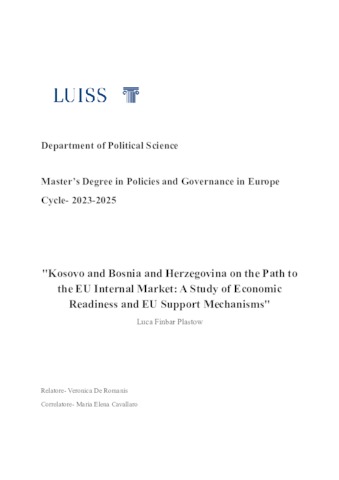 Plastow, Luca Finbar (A.A. 2024/2025) Kosovo and Bosnia and Herzegovina on the path to the EU internal market: a study of economic readiness and EU support mechanisms. Tesi di Laurea in The economics of Europe, Luiss Guido Carli, relatore Veronica De Romanis, pp. 85. [Master's Degree Thesis]