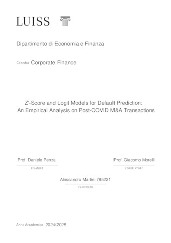 Martini, Alessandro (A.A. 2024/2025) Z’-score and logit models for default prediction: an empirical analysis on post-Covid M&A transactions. Tesi di Laurea in Risk management, Luiss Guido Carli, relatore Daniele Penza, pp. 61. [Master's Degree Thesis]