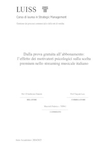 Mazzitelli, Federico (A.A. 2024/2025) Dalla prova gratuita all’abbonamento: l’effetto dei motivatori psicologici sulla scelta premium nello streaming musicale italiano. Tesi di Laurea in Gestione dei processi commerciali e delle reti di vendita, Luiss Guido Carli, relatore Daniele D'Ambrosio, pp. 99. [Master's Degree Thesis]