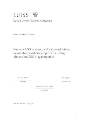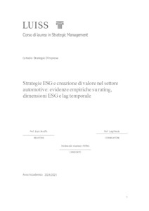 Giustozzi, Ferdinando (A.A. 2024/2025) Strategie ESG e creazione di valore nel settore automotive: evidenze empiriche su rating, dimensioni ESG e lag temporale. Tesi di Laurea in Strategie d'impresa, Luiss Guido Carli, relatore Enzo Peruffo, pp. 128. [Master's Degree Thesis]