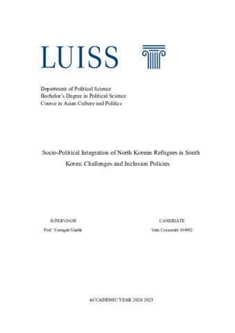 Corasaniti, Siria (A.A. 2024/2025) Socio-political integration of north Korean refugees in South Korea: challenges and inclusion policies. Tesi di Laurea in Asian culture and politics, Luiss Guido Carli, relatore Youngah Guahk, pp. 51. [Bachelor's Degree Thesis]