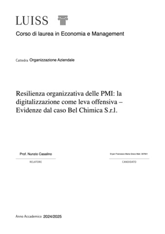 Greco, Eryan Francesco Maria (A.A. 2024/2025) Resilienza organizzativa delle PMI: la digitalizzazione come leva offensiva: evidenze dal caso Bel Chimica S.r.l. Tesi di Laurea in Organizzazione aziendale, Luiss Guido Carli, relatore Nunzio Casalino, pp. 96. [Bachelor's Degree Thesis]