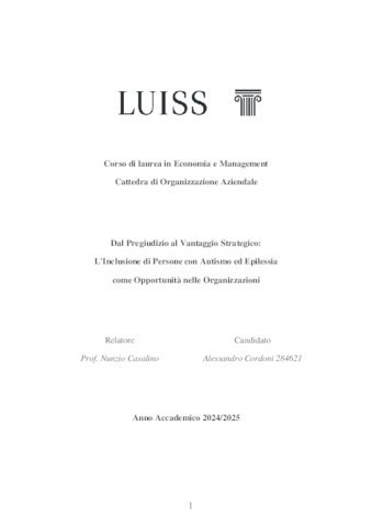 Cordoni, Alessandro (A.A. 2024/2025) Dal pregiudizio al vantaggio strategico: l'inclusione di persone con autismo ed epilessia come opportunità nelle organizzazioni. Tesi di Laurea in Organizzazione aziendale, Luiss Guido Carli, relatore Nunzio Casalino, pp. 111. [Bachelor's Degree Thesis]