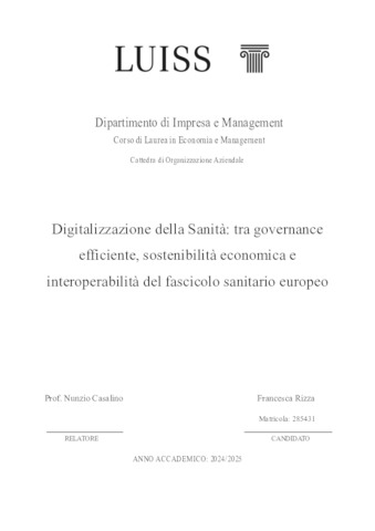 Rizza, Francesca (A.A. 2024/2025) Digitalizzazione della sanità: tra governance efficiente, sostenibilità economica e interoperabilità del fascicolo sanitario europeo. Tesi di Laurea in Organizzazione aziendale, Luiss Guido Carli, relatore Nunzio Casalino, pp. 84. [Bachelor's Degree Thesis]