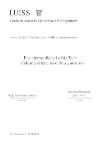 Pansarella, Giuseppe (A.A. 2024/2025) Piattaforme digitali e BigTech: sfide regolatorie tra diritto e mercato. Tesi di Laurea in Diritto di internet: social media e discriminazione, Luiss Guido Carli, relatore Pietro Santo Falletta, pp. 47. [Bachelor's Degree Thesis]