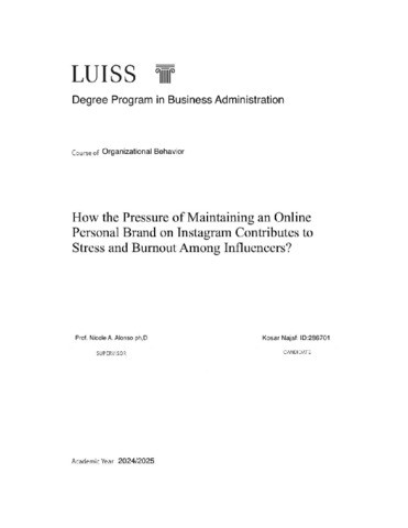 Najafi, Kosar (A.A. 2024/2025) How the pressure of maintaining an online personal brand on Instagram contributes to stress and burnout among influencers? Tesi di Laurea in Organizational behavior, Luiss Guido Carli, relatore Nicola Ashley Alonso, pp. 43. [Bachelor's Degree Thesis]