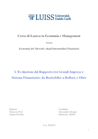 Sdogati, Alessandro (A.A. 2024/2025) L’evoluzione del rapporto tra grandi imprese e sistema finanziario: da Rockefeller a Belfort e oltre. Tesi di Laurea in Economia dei mercati e degli intermediari finanziari, Luiss Guido Carli, relatore Gianni Nicolini, pp. 32. [Bachelor's Degree Thesis]