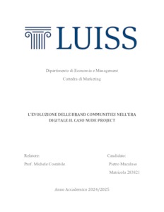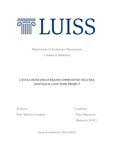 Macaluso, Pietro (A.A. 2024/2025) L’evoluzione delle brand communities nell’era digitale: il caso nude project. Tesi di Laurea in Marketing, Luiss Guido Carli, relatore Michele Costabile, pp. 47. [Bachelor's Degree Thesis]
