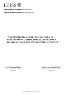 La Gioia, Matteo (A.A. 2024/2025) Il business della sanità privata in Italia: modelli organizzativi, sistemi di gestione e relazione con il servizio sanitario nazionale. Tesi di Laurea in Economia aziendale, Luiss Guido Carli, relatore Giovanni Fiori, pp. 68. [Bachelor's Degree Thesis]