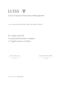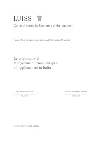 Sette, Simone (A.A. 2024/2025) Le cripto-attività: la regolamentazione europea e l’applicazione in Italia. Tesi di Laurea in Economia dei mercati e degli intermediari finanziari, Luiss Guido Carli, relatore Francesco Cerri, pp. 62. [Bachelor's Degree Thesis]