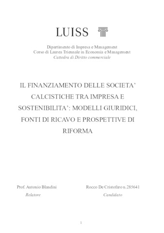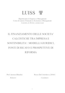 De Cristofaro, Rocco (A.A. 2024/2025) Il finanziamento delle società calcistiche tra impresa e sostenibilità: modelli giuridici, fonti di ricavo e prospettive di riforma. Tesi di Laurea in Diritto commerciale, Luiss Guido Carli, relatore Antonio Blandini, pp. 47. [Bachelor's Degree Thesis]