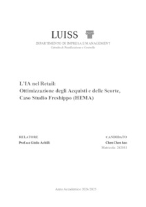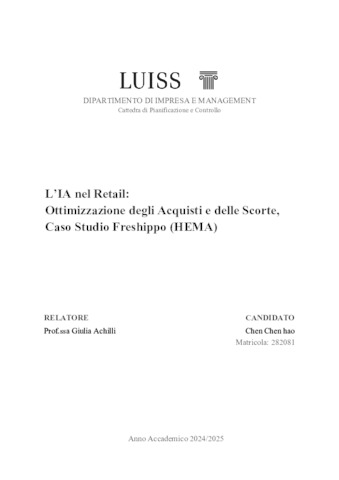 Chen, Chen Hao (A.A. 2024/2025) L’IA nel retail: ottimizzazione degli acquisti e delle scorte, caso studio Freshippo (HEMA). Tesi di Laurea in Pianificazione e controllo, Luiss Guido Carli, relatore Giulia Achilli, pp. 75. [Bachelor's Degree Thesis]
