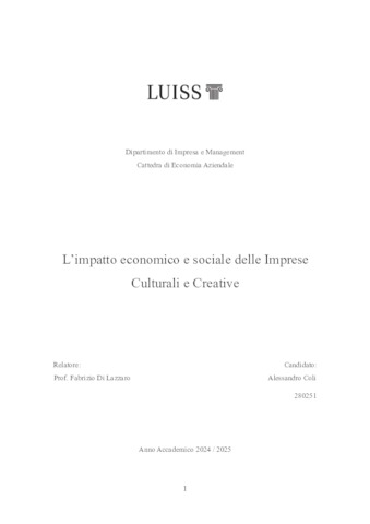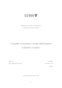 Coli, Alessandro (A.A. 2024/2025) L’impatto economico e sociale delle imprese culturali e creative. Tesi di Laurea in Economia aziendale, Luiss Guido Carli, relatore Fabrizio Di Lazzaro, pp. 101. [Bachelor's Degree Thesis]