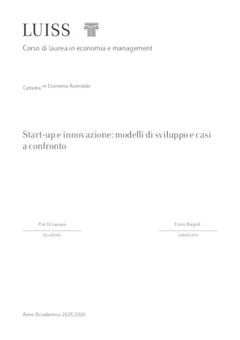 Biagioli, Ettore (A.A. 2024/2025) Start-up e innovazione: modelli di sviluppo e casi a confronto. Tesi di Laurea in Economia aziendale, Luiss Guido Carli, relatore Fabrizio Di Lazzaro, pp. 97. [Bachelor's Degree Thesis]