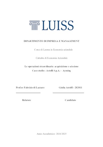 Astolfi, Giulia (A.A. 2024/2025) Le operazioni straordinarie: acquisizione e scissione: caso studio: Astofli S.p.a.-Ayming. Tesi di Laurea in Economia aziendale, Luiss Guido Carli, relatore Fabrizio Di Lazzaro, pp. 50. [Bachelor's Degree Thesis]