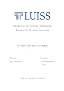 Restante, Alessandro (A.A. 2024/2025) Revolut come banca del futuro. Tesi di Laurea in Matematica finanziaria, Luiss Guido Carli, relatore Paola Fersini, pp. 92. [Bachelor's Degree Thesis]