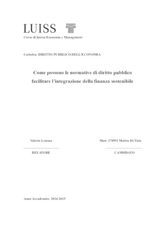 Di Tizio, Matteo (A.A. 2024/2025) Come possono le normative di diritto pubblico facilitare l’integrazione della finanza sostenibile. Tesi di Laurea in Diritto pubblico dell'economia, Luiss Guido Carli, relatore Valerio Lemma, pp. 54. [Bachelor's Degree Thesis]